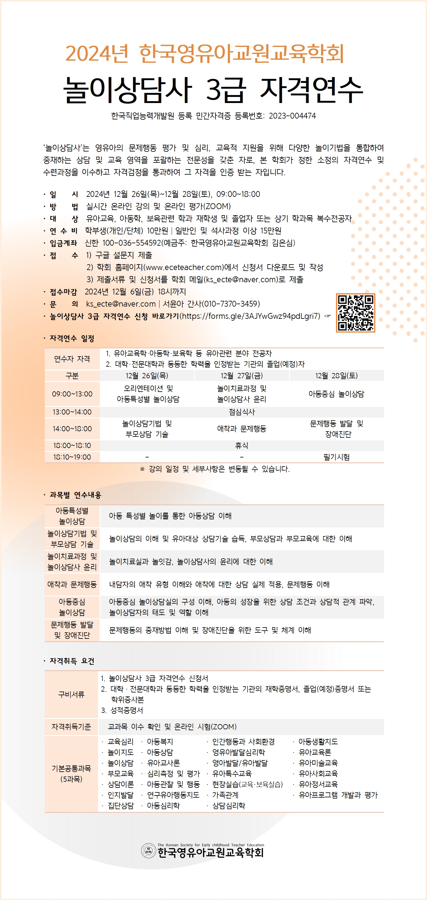 [한국영유아교원교육학회]2024년 놀이상담사 3급 자격연수(2024년 12월 26일 목요일~12월 28일 토요일)