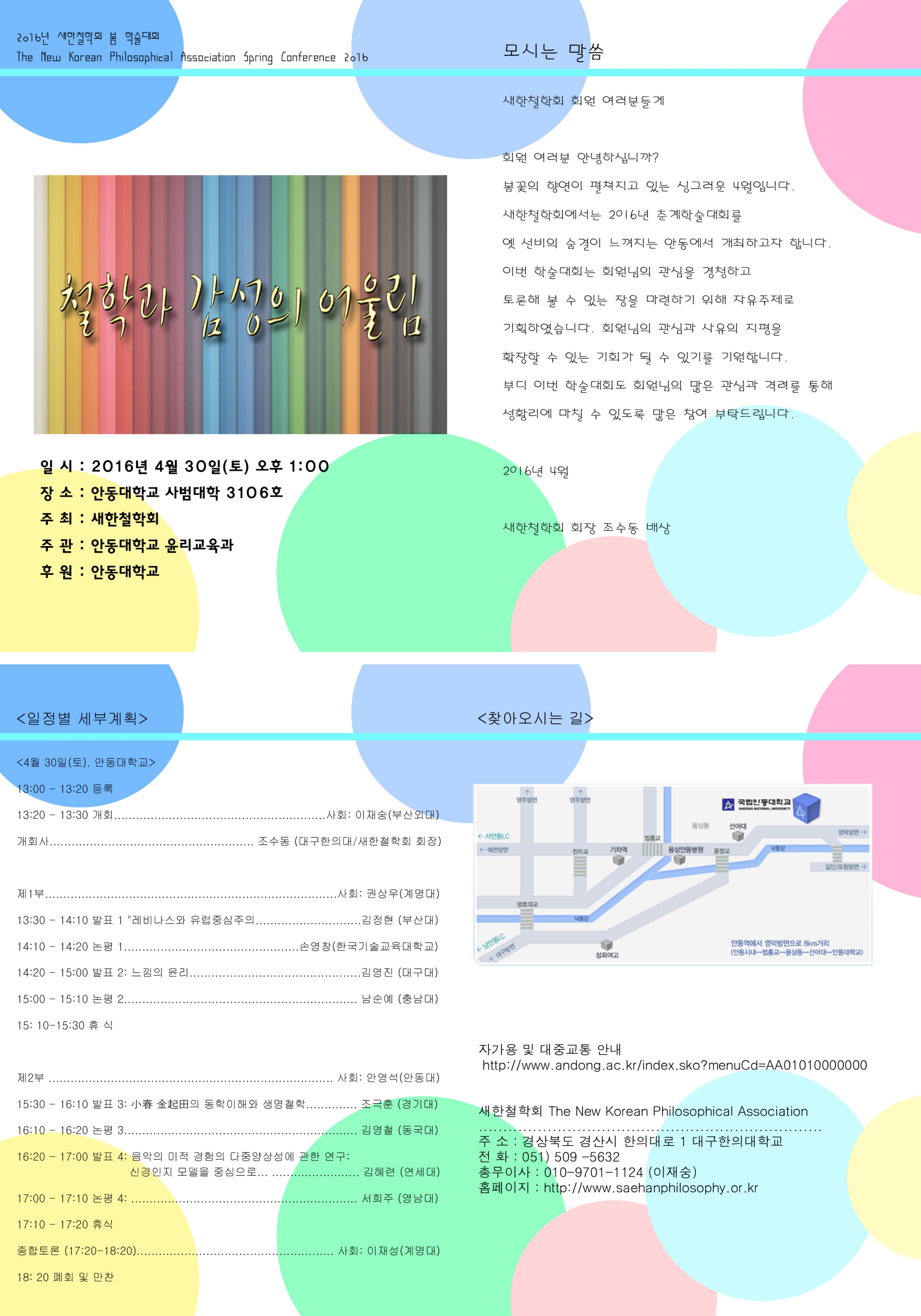 2016년 새한철학회 봄 학술대회를 '철학과 감성의 어울림이란 주제로 4월 30일 안동대학교 사범대학에서 개최됩니다. 많은 참석 부탁 드립니다. 자세한 사항은 첨부된 안내장을 참조하시기 바랍니다.